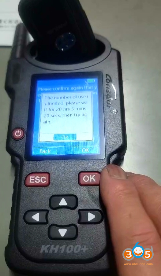 Tried to unlock Toyota smart key with Lonsdor KH100+ key tool but failed. It said the number of use is limited and asked waiting for 20hrs. How to fix it?